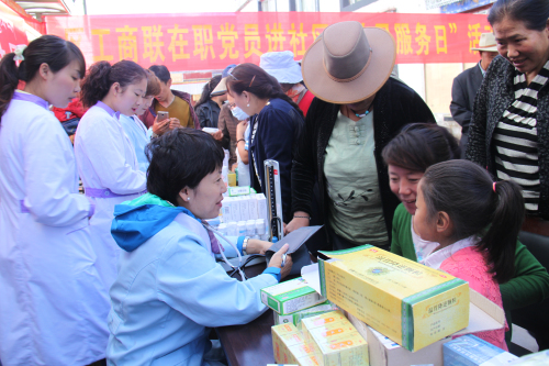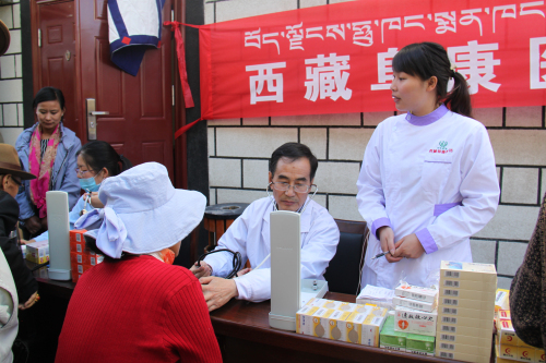 根據(jù)自治區(qū)工商聯(lián)《關(guān)于深化區(qū)直機(jī)關(guān)在職黨員到社區(qū)服務(wù)群眾活動》的統(tǒng)一安排:阜康醫(yī)藥有限公司四個黨支部,在張德才總院長的帶領(lǐng)下,一行8人在2015年8月8日上午到拉薩市城關(guān)區(qū)嘎瑪貢桑社區(qū)進(jìn)行義診活動,帶著1.5萬余元藥品和便攜式B超,心電圖等。在半天時間內(nèi)貢義診380余人,為社區(qū)群眾進(jìn)行了測量血壓、發(fā)放藥品、健康咨詢等,受到了社區(qū)群眾的熱烈歡迎。期間正在慰問群眾的自治區(qū)政協(xié)副主席阿沛晉源,和區(qū)統(tǒng)戰(zhàn)部副部長、區(qū)工商聯(lián)黨組副書記李瑞富等領(lǐng)導(dǎo)的高度評價。