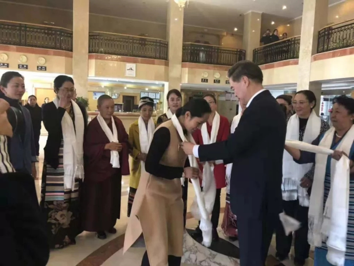 西藏自治區(qū)黨委常委、組織部部長(zhǎng)曾萬(wàn)明為西藏阜康醫(yī)藥發(fā)展有限公司總經(jīng)理劉瀟瀟女士獻(xiàn)上潔白的哈達(dá)
