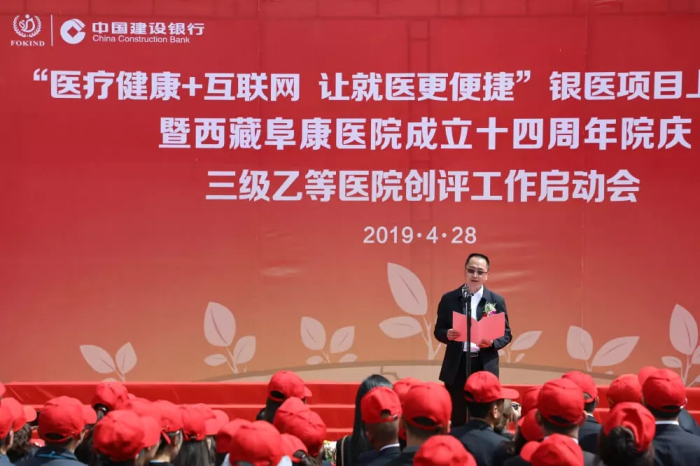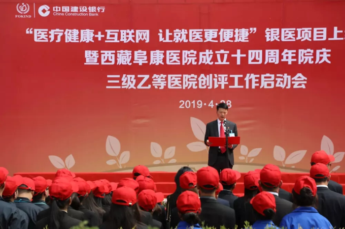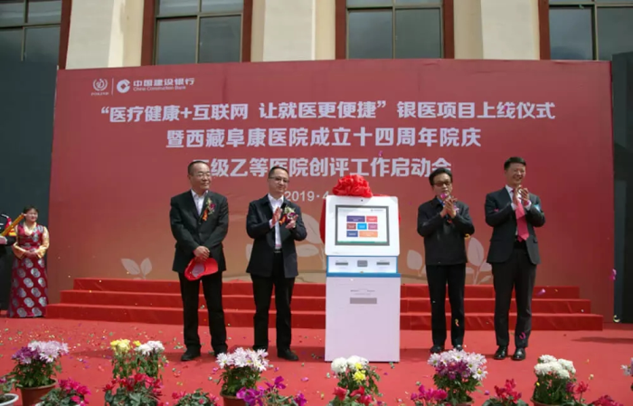 春日的圣城拉薩陽光明媚,生機(jī)盎然。2019年4月28日,注定是一個(gè)不平凡的日子!下午15時(shí),來自自治區(qū)政府部門、各大金融機(jī)構(gòu)、科技教育單位的12位嘉賓和阜康醫(yī)院的廣大醫(yī)務(wù)人員匯聚一堂,共同見證建設(shè)銀行西藏分行、西藏阜康醫(yī)院“醫(yī)療健康+互聯(lián)網(wǎng),讓就醫(yī)更健康”銀醫(yī)項(xiàng)目上線暨阜康醫(yī)院成立十四周年院慶三級(jí)乙等醫(yī)院創(chuàng)評(píng)工作正式啟動(dòng),標(biāo)志著在雪域高原上成功走過十四年光輝歷程的阜康醫(yī)院,正在一個(gè)全新的起點(diǎn)上承載著“健康西藏”的光榮使命再次揚(yáng)帆遠(yuǎn)航、整裝出發(fā)!