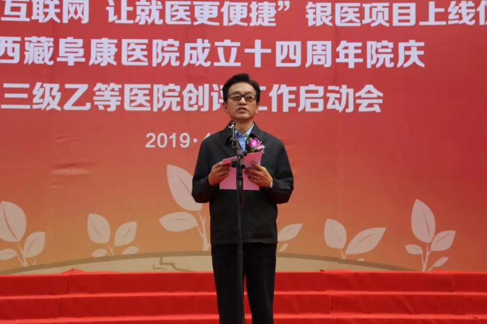 西藏阜康醫(yī)療股份有限公司黨委書記、董事長王斌對(duì)各位領(lǐng)導(dǎo)和嘉賓的到來表示由衷感謝,堅(jiān)決相信銀醫(yī)合作項(xiàng)目的啟動(dòng)將極大提高院內(nèi)就診與醫(yī)療服務(wù)效率,提升患者就醫(yī)滿意度。阜康也將由此迎來“互聯(lián)網(wǎng)+智慧醫(yī)療”的新時(shí)代。