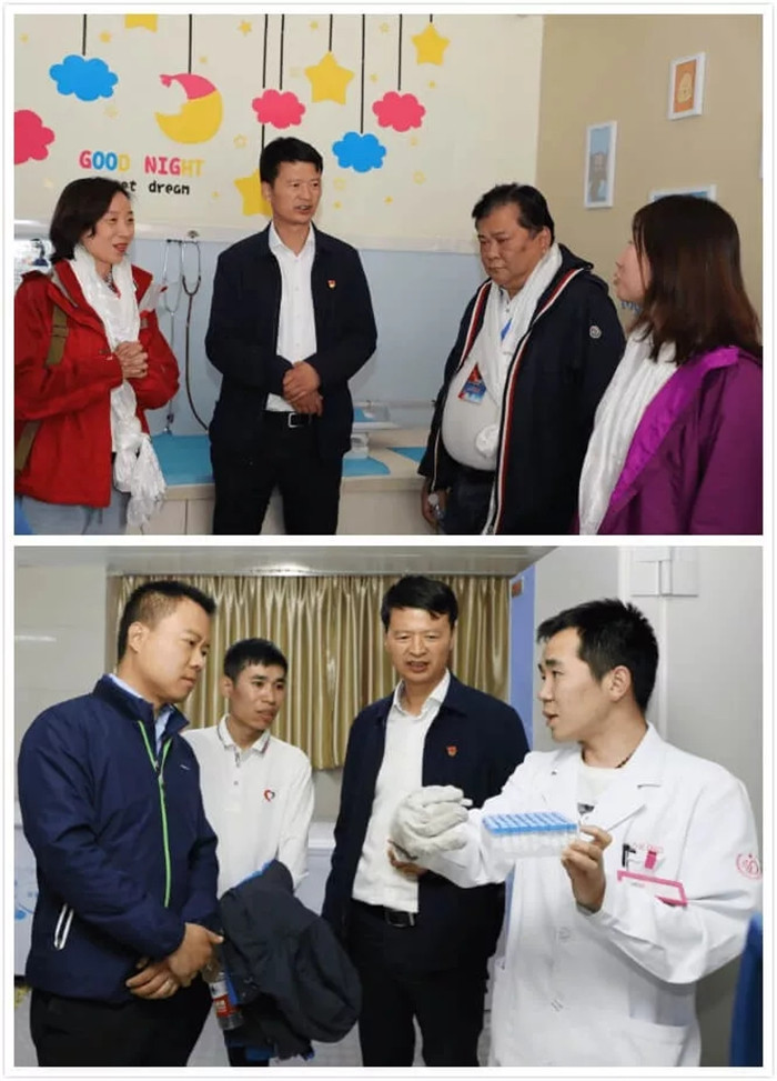 義診期間,中共中央統(tǒng)戰(zhàn)部七局處長(zhǎng)郭鵬與“同心共鑄中國(guó)心”駐西藏秘書長(zhǎng)趙士磊來(lái)到了阜康婦產(chǎn)兒童醫(yī)院詳細(xì)查看了正在井然有序進(jìn)行的義診現(xiàn)場(chǎng),在王斌董事長(zhǎng)陪同下參觀阜康婦產(chǎn)兒童醫(yī)院院區(qū),聽(tīng)取并查看了我院人類輔助生殖醫(yī)學(xué)中心等特色科室的開(kāi)展情況。