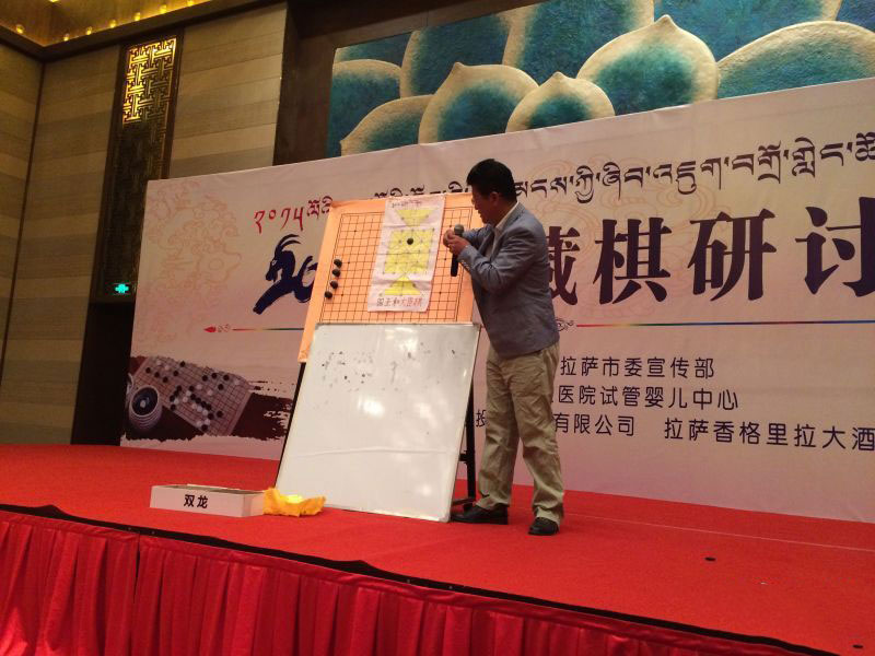 11月7日上午10時(shí)30分,2015中國(guó)藏棋研討會(huì)在香格里拉大酒店1號(hào)宴會(huì)廳開(kāi)幕,阿旺邊巴老師現(xiàn)場(chǎng)講解藏棋歷史沿革、發(fā)展分布概況及藏式圍棋(密芒)、久、國(guó)王與大臣等藏棋介紹。并與現(xiàn)場(chǎng)人員互動(dòng)演繹“國(guó)王與大臣棋”、“魚(yú)棋”等。