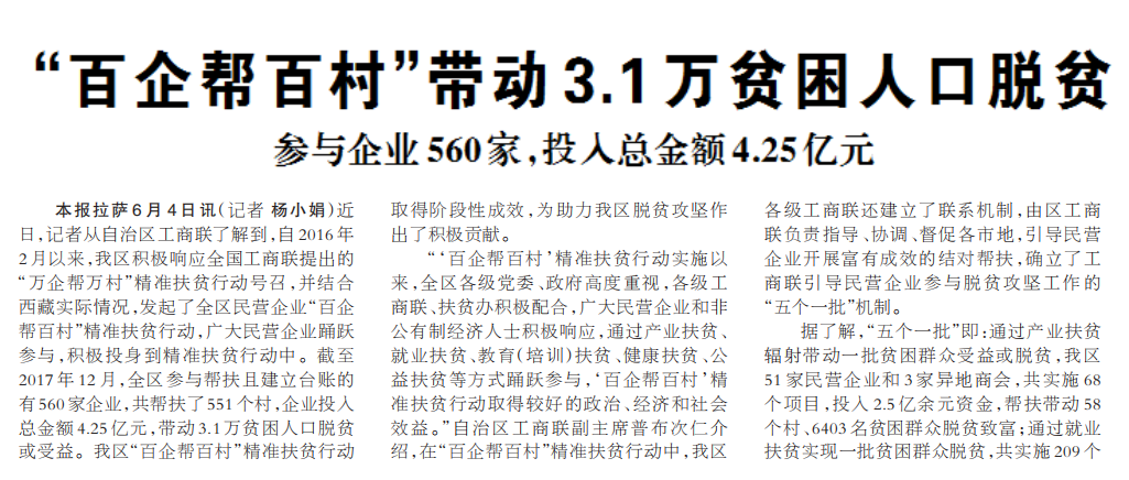 本報拉薩6月4日訊(記者 楊小娟)近日,記者從自治區(qū)工商聯(lián)了解到,自2016年2月以來,我區(qū)積極響應(yīng)全國工商聯(lián)提出的“萬企幫萬村”精準(zhǔn)扶貧行動號召,并結(jié)合西藏實際情況,發(fā)起了全區(qū)民營企業(yè)“百企幫百村”精準(zhǔn)扶貧行動,廣大民營企業(yè)踴躍參與,積極投身到精準(zhǔn)扶貧行動中。截至2017年12月,全區(qū)參與幫扶且建立臺賬的有560家企業(yè),共幫扶了551個村,企業(yè)投入總金額4.25億元,帶動3.1萬貧困人口脫貧或受益。我區(qū)“百企幫百村”精準(zhǔn)扶貧行動取得階段性成效,為助力我區(qū)脫貧攻堅作出了積極貢獻(xiàn)。