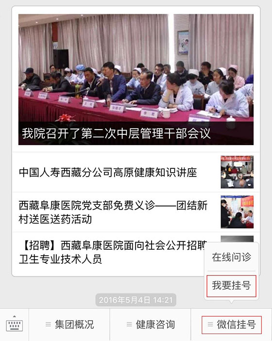 西藏阜康醫(yī)院微信公眾平臺網(wǎng)上預約掛號系統(tǒng)現(xiàn)已正式上線,可提供微信掛號、在線問診、健康咨詢、新聞動態(tài)等服務,我們通過信息的推送,增加與新老朋友的互動。