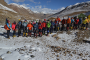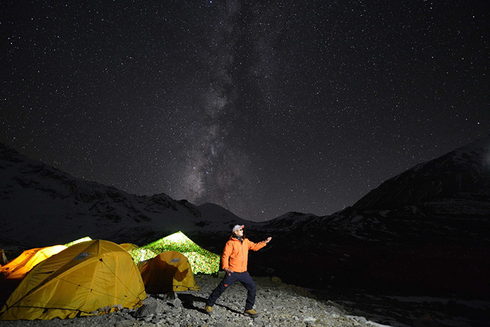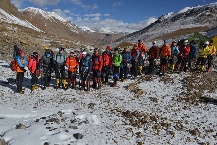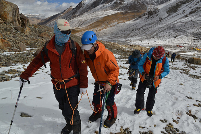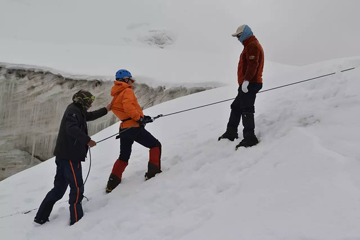 在海拔5500米處的雪線位置,教練們,選擇了一處較為平緩的雪坡,作為大本營,在這里對隊員們進(jìn)行登頂前的指導(dǎo)訓(xùn)練。指導(dǎo)隊員們使用上升器與下降器,體驗穿著高山靴帶著冰爪走路的感覺,教練們在這里認(rèn)真介紹技術(shù)要領(lǐng),并耐心解答隊員們提出的各種問題。休息之余大家都躲在帳篷里,有說有笑,完全消除了屋外雪山的寒冷。有從內(nèi)地來的隊友,因高原反應(yīng),頭疼難忍,張洪就幫他們一一按摩推拿,緩解疼痛,大家就像一家人,其樂融融。