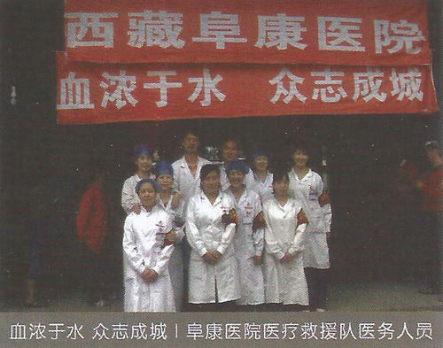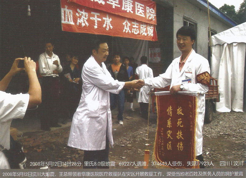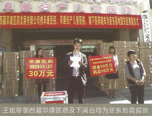 2008年5月12日14時28分,在得知發(fā)生在四川汶川8級的強烈地震后,王斌被深深的震撼了,5月13日第一時間帶頭捐款并號召全公司347名員工為災(zāi)區(qū)人民獻愛心,在王斌的帶領(lǐng)下短短的一上午公司即向西藏紅十字會捐款10062萬元(其中王斌個人捐款5062萬元)。13日下午,王斌隨即召開阜康醫(yī)院醫(yī)務(wù)人員趕赴災(zāi)區(qū)醫(yī)療救援動員大會,并迅速組建了一支由他本人作為領(lǐng)隊的26人醫(yī)療救援隊。同時他還帶領(lǐng)醫(yī)療隊為盡快抵達地震災(zāi)區(qū)并第一時間參與醫(yī)療救援,而且決定在成都臨時購買一輛配備完善的救護車,還包括大量藥品、生活物品、以及部分醫(yī)療設(shè)備,此次救災(zāi)共投入130余萬元。