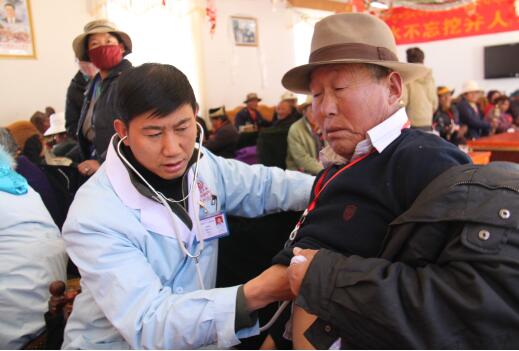 離義診時(shí)間還有二十多分鐘,現(xiàn)場(chǎng)就聚集了像洛桑一樣的20多位老人,他們井然有序的排隊(duì)等著念到自己的名字,醫(yī)生開始為老人們測(cè)血壓、問(wèn)病情、開處方、發(fā)藥品。大家忙的不亦樂(lè)乎。