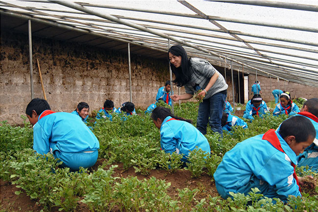 圖:白覺措帶領(lǐng)學生們在溫棚勞動