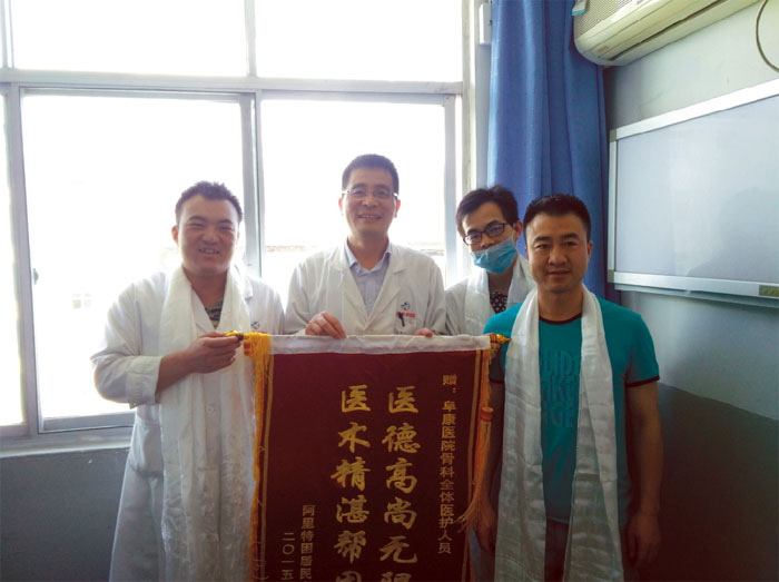 2015年5月23日,外一科收治一名來自曲樂鄉(xiāng)尼雄二村名叫扎西(化名)的病人,診斷為右脛骨開放性粉碎性骨折并大面積皮膚壞死,住院63天,共四次手術(shù)。因經(jīng)濟困難,無法承擔所欠的四萬兩千余元。向上級領(lǐng)導(dǎo)匯報后,王斌董事長指示:先治病,所欠費用由雪域天使基金會補充。出院當天,患者及家屬為我院骨科醫(yī)生獻上哈達和錦旗以表感謝之情。