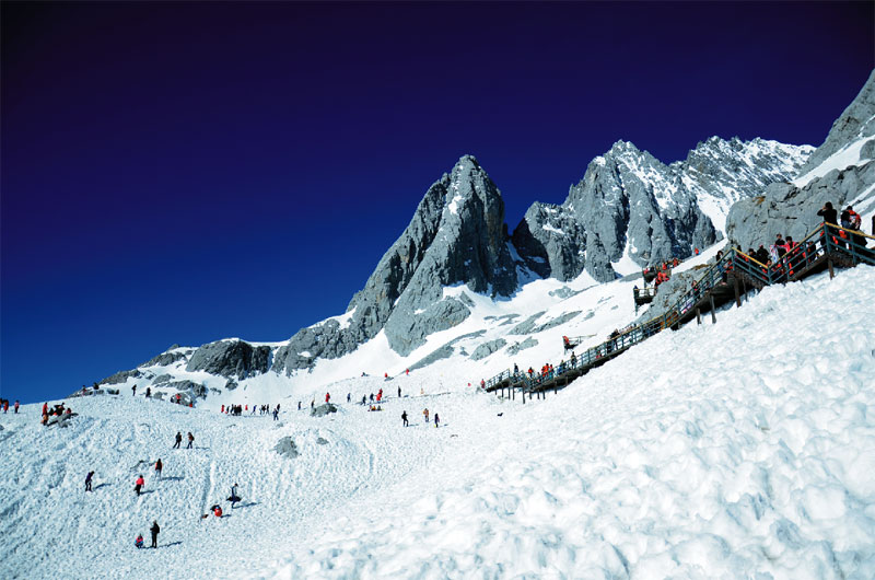人文的掃興,索性來場自然之旅。第二天一大早我們就前往了玉龍雪山,還是被告知到達(dá)最高峰的索道票昨日售盡,我們的索道只到得了松杉坪?;貞浧饋恚@也許值得慶幸。松杉坪松樹高聳如云,木棧道旁有積雪未化,風(fēng)過樹梢的積雪隨風(fēng)灑落,偶爾有小松鼠一躍而過,牦牛悠閑自在的吃著草,遠(yuǎn)處是玉龍雪山的最高峰,仿佛近在咫尺。我想所有的生生死死都應(yīng)該在這里戛然而止,所有浮躁的靈魂都應(yīng)該在這里接受洗禮,進(jìn)入輪回,拋卻紅塵暫享這片刻的永生。她是我去過最接近天堂的地方,