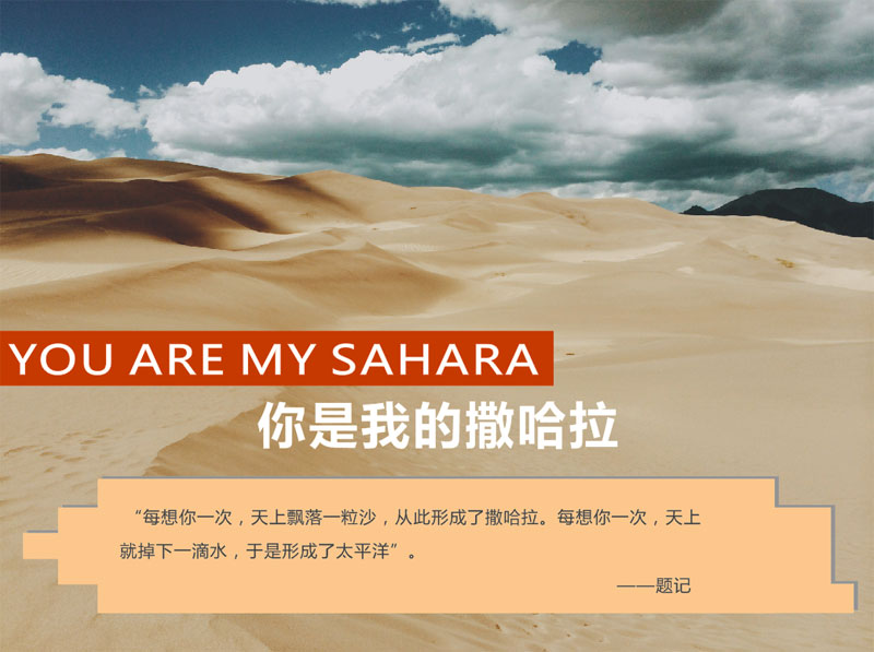 回想起第一次與你邂逅是在你《撒哈拉沙漠的故事》里,走進你的撒哈拉,即使這里狂風驟沙,我仍可見你內心深處的安寧與幸福,你仿佛化作一只輕柔的蝶穿梭在這片風塵里,尋覓著這里每一粒沙,每一顆石,每一縷風,洋溢著生活里的寧靜與美好,只因那最愛你的蝶一直陪在你身旁,如此簡單。