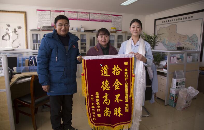 2017年2月8日上午,一對來我院就診的夫婦不慎將錢包遺落在收費室。該科室工作人員劉明雨偶然拾到,并主動將錢包以及錢包里的財物絲毫不差地上交了醫(yī)院辦公室。所幸,物還失主。出于對阜康婦產(chǎn)兒童醫(yī)院收費室劉明雨同志的誠摯感謝,2月10日下午,這對夫婦贈送劉明雨鮮紅錦旗——拾金不昧,道德高尚!