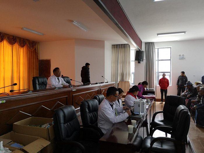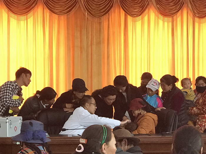 隨后,阜康義診隊(duì)對前來咨詢和檢查的牧民做了詳細(xì)的解答和初步的身體檢查。周健主治醫(yī)師負(fù)責(zé)測量血壓、了解老百姓的基本健康情況,唐宗青護(hù)士負(fù)責(zé)給牧民測血糖,瓊瑪副主任醫(yī)師和榮瑪鄉(xiāng)高海拔生態(tài)搬遷點(diǎn)醫(yī)務(wù)室的同志負(fù)責(zé)給老百姓發(fā)放藥品,工作在有條不紊中進(jìn)行。