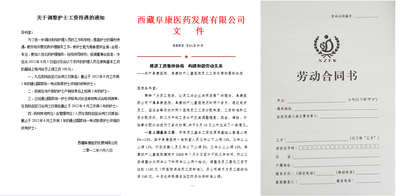 關(guān)于調(diào)整護士工資待遇的通知(左一)、推進工資集體協(xié)商 構(gòu)建和諧勞動關(guān)系(左二)、勞動合同書(右一)