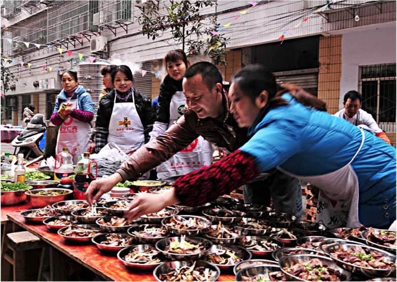 要操辦一場(chǎng)壩壩宴,首先要請(qǐng)一個(gè)專業(yè)的“廚子”,他會(huì)提前幾天跟主人溝通好菜單。給你時(shí)間買好材料、宰殺牲畜、劈好柴火、挖好土灶(上大蒸籠用),去專門租賃土碗杯碟和蒸籠的人家“聘碗”,再請(qǐng)幾個(gè)妯娌幫忙當(dāng)天打下手,請(qǐng)幾個(gè)壯年男人“掌盤”  (傳菜)。其次要請(qǐng)“知客”(相當(dāng)于現(xiàn)在的婚禮、壽慶司儀),專門為主人登記彩禮,活躍氣氛,安排賓客活動(dòng)。